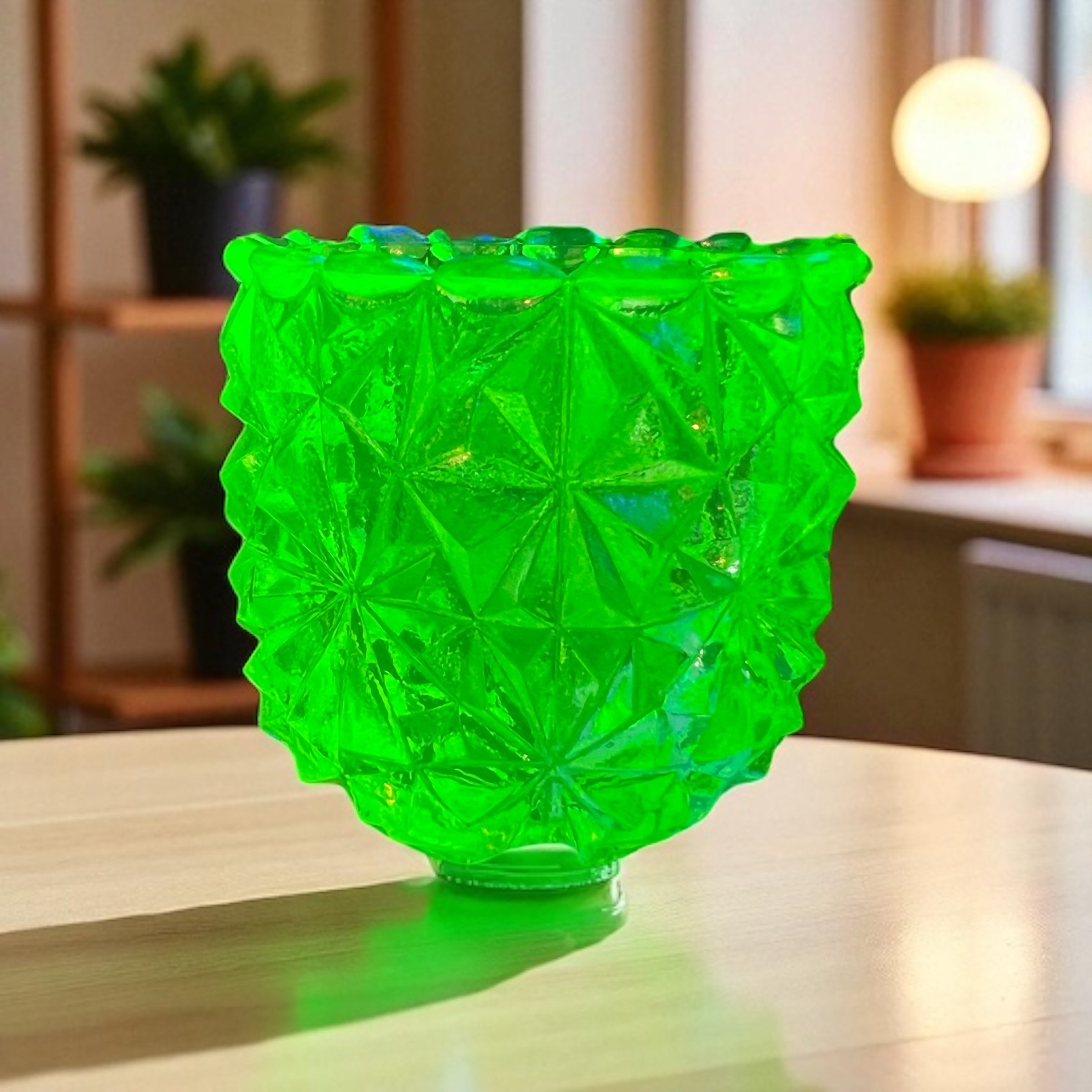 This is a Uranium glass toothpick holder. Uranium glass is very interesting. It was manufactured from the mid-19th century to the early 20th century. It gets its distinctive yellow-green hue from the addition of uranium oxide during manufacturing. The amount of uranium is considered safe, and the glass is collectible. This toothpick holder will glow under a black light and amaze your friends!